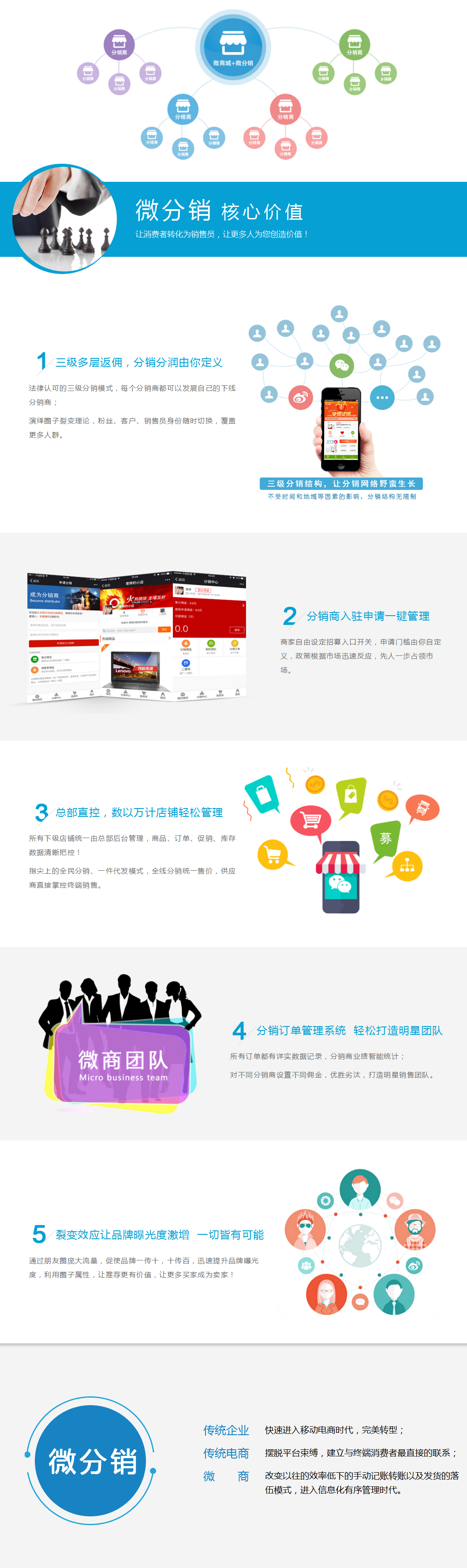 微分销是一款"微商城+微分销"多层级一体化微信分销成交平台,以总部布控,发动分销商,发展消费者参与分销建立二级店铺的微信店中店系统,协助企业打造"企业微商城+代理分店+粉丝微店"的多层级微信创客营销模式,基于朋友圈的传播,店中店模式可快速复制店铺,轻松将成千上万的粉丝变成微信分销商,迅速扩展销售渠道和提升产品知名度。